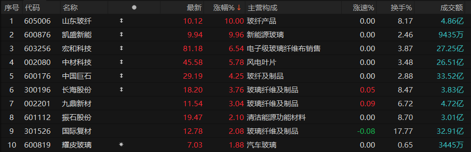 4月10日,玻璃玻纤板块大涨,山东玻纤、凯盛新能涨停,宏和科技、中材科技、中国巨石等跟涨。