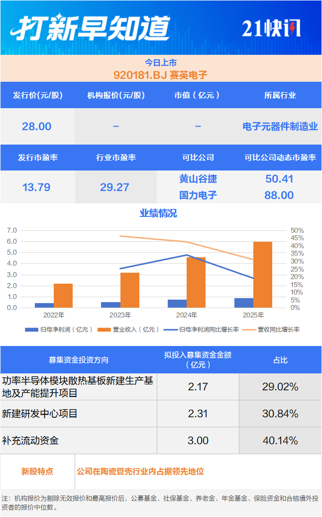 4月10日,可申购主板的福恩股份(001312.SZ);另有三只新股上市,分别是创业板的三瑞智能(301696.SZ)、科创板的有研复材(688811.SH)、北交所的赛英电子(920181.BJ)。