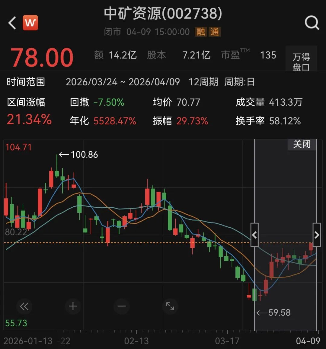 Wind数据显示,4月9日,中矿资源股价收报78元/股,最新市值为563亿元。3月24日至4月9日,中矿资源股价从近期低点持续回升,累计涨幅为21.34%。