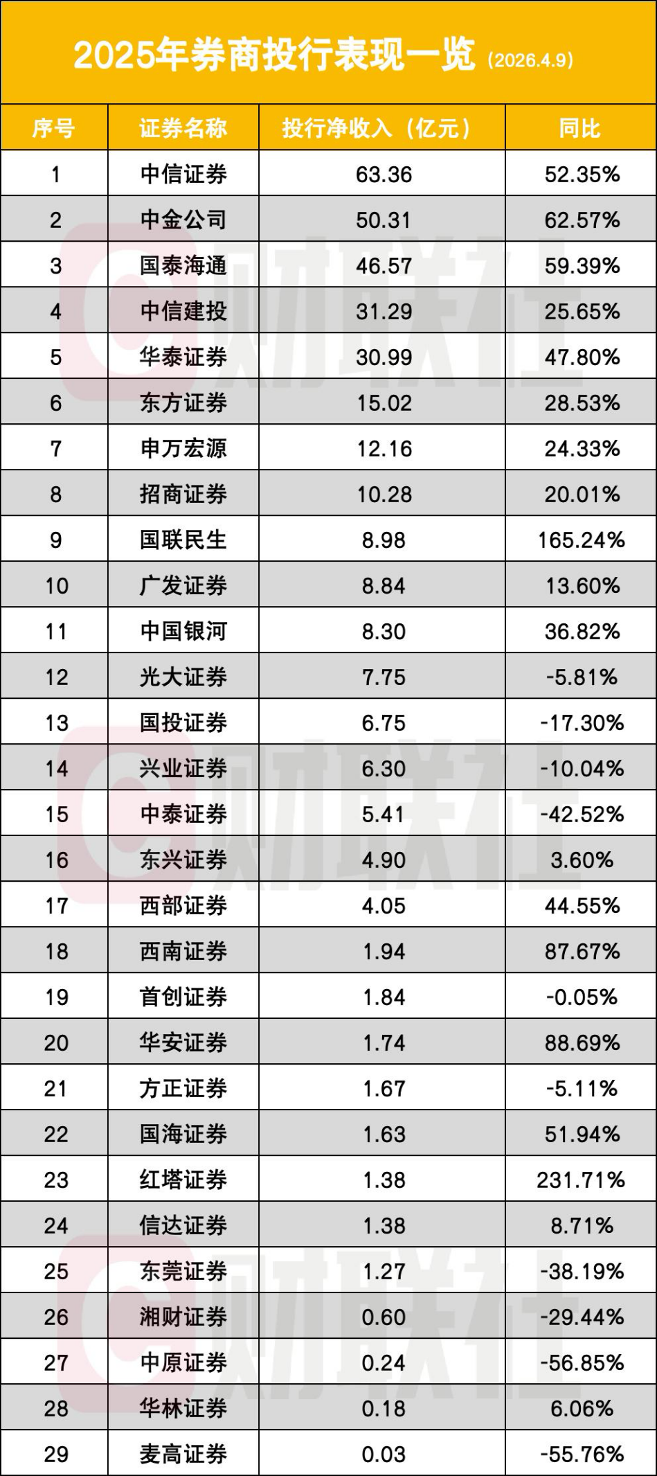 以目前数据已公布的29家券商来看,2025年投行业务净收入合计为335.17亿元,同比增41.14%;其中19家正增长,占比为65.52%。