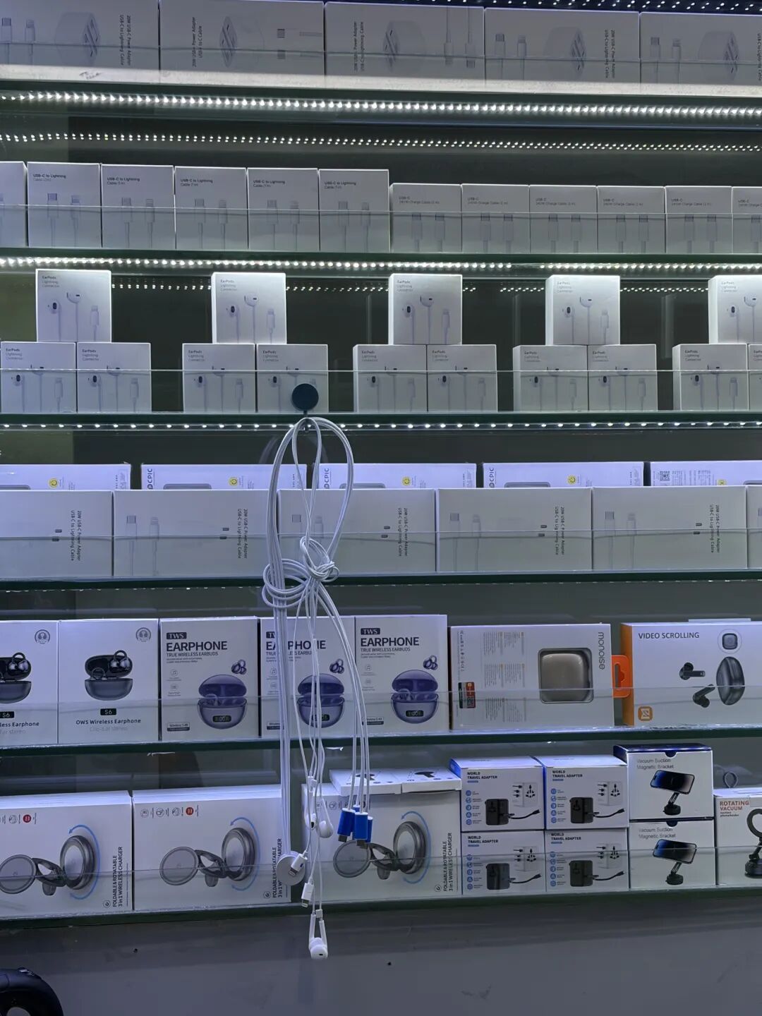 每经记者在走访中注意到,多数耳机档口内,有线耳机要么被摆放在柜台下方不显眼位置,要么零散堆放在塑料袋中,仅有少数档口将其陈列于货架,产品价格多集中在十几元至几十元区间。与之形成鲜明对比的是,蓝牙耳机占据着店内核心展示位置,品类更丰富、价格梯度更完整,到店客流也大多聚焦于蓝牙耳机的体验与选购。
