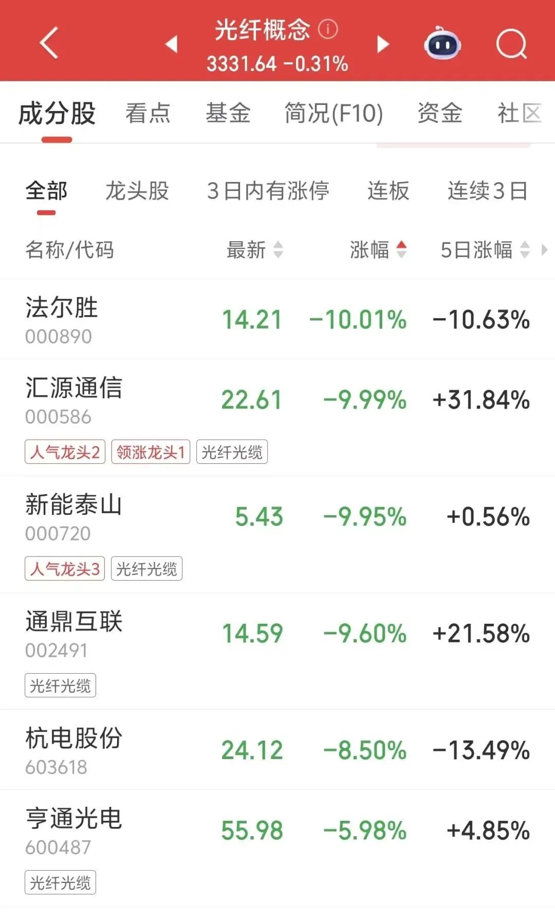4月10日,光纤概念集体走弱。法尔胜、 5连板汇源通信跌停,亨通光电跌近6%,长飞光纤跌超3%,港股长飞光纤光缆盘中一度跌超12%。