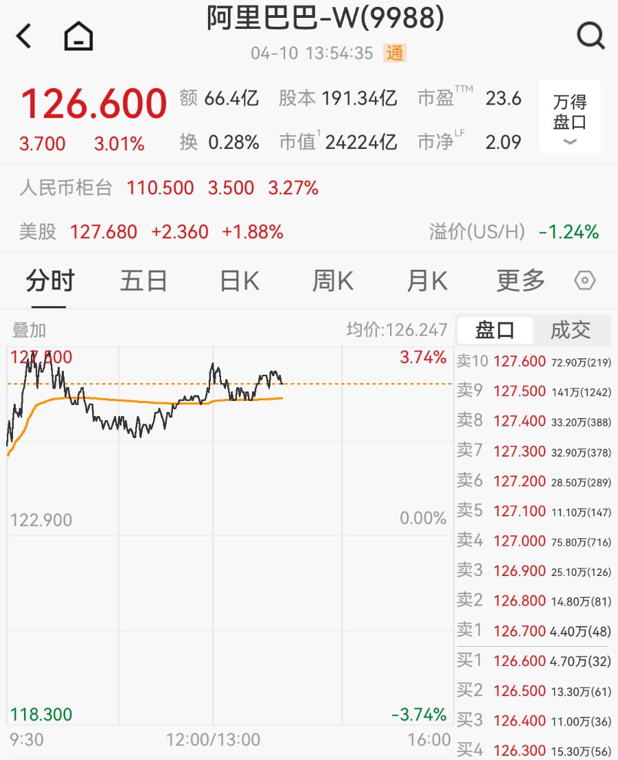截至4月10日13:54,阿里巴巴股价涨超3%,报126.6港元/股,总市值为2.42万亿港元。
