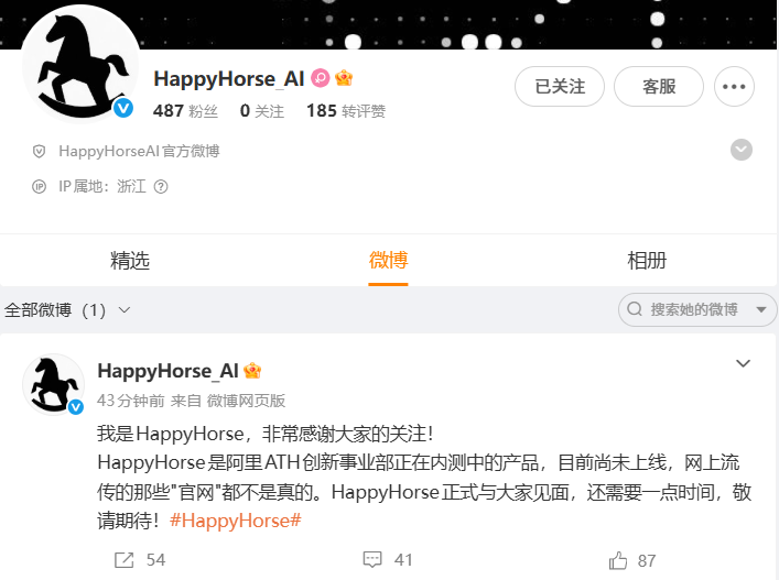 当天,阿里巴巴ATH方面向《21辟谣》记者表示,HappyHorse是阿里巴巴ATH旗下创新事业部研发的模型,目前正处于内测中,也会于近期开放API。ATH创新事业部已启动一个AI时代的全新交互方式探索计划,HappyHorse是这个探索方向的一部分,更多的产品会陆续推出。
