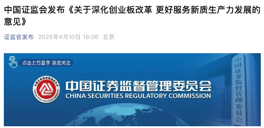 4月10日,证监会正式发布《关于深化创业板改革 更好服务新质生产力发展的意见》(以下简称《创业板意见》)。这距离证监会主席吴清在2026年两会经济主题记者会上首次宣布将发布创业板改革政策恰好过去35天。