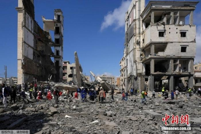 当地时间2026年4月8日,黎巴嫩一处遭以色列空袭的废墟,救援人员正在开展工作。