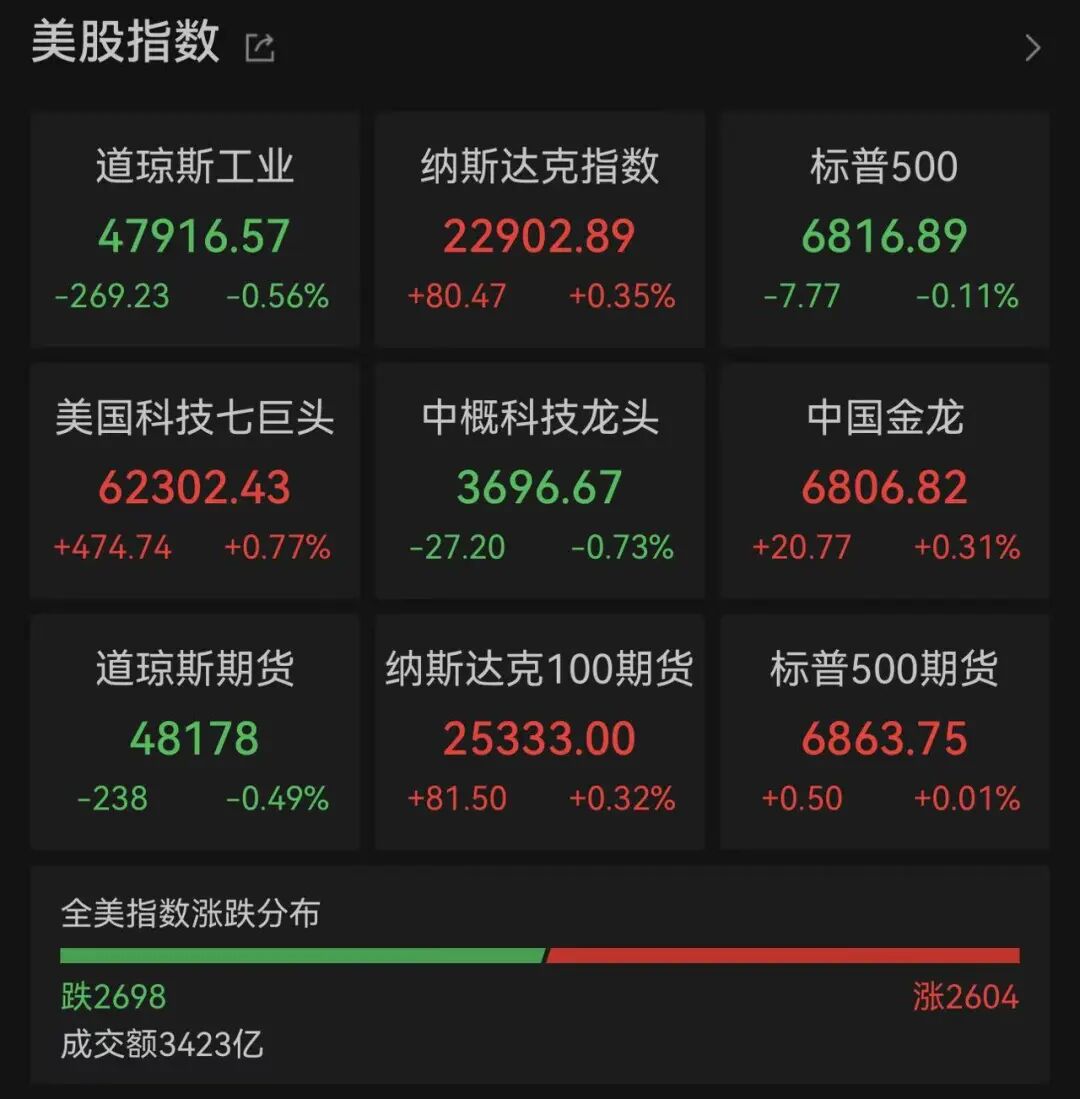 周五(4月10日),美股三大指数大幅震荡,盘中一度跳水,道指、标普500指数收跌,受英伟达等半导体股票提振,纳指录得八连涨。 截至收盘,纳斯达克综合指数涨0.35%,报22902.89点;标普500指数跌0.11%,报6816.89点,结束7连涨;道琼斯指数跌0.56%,报47916.57点。