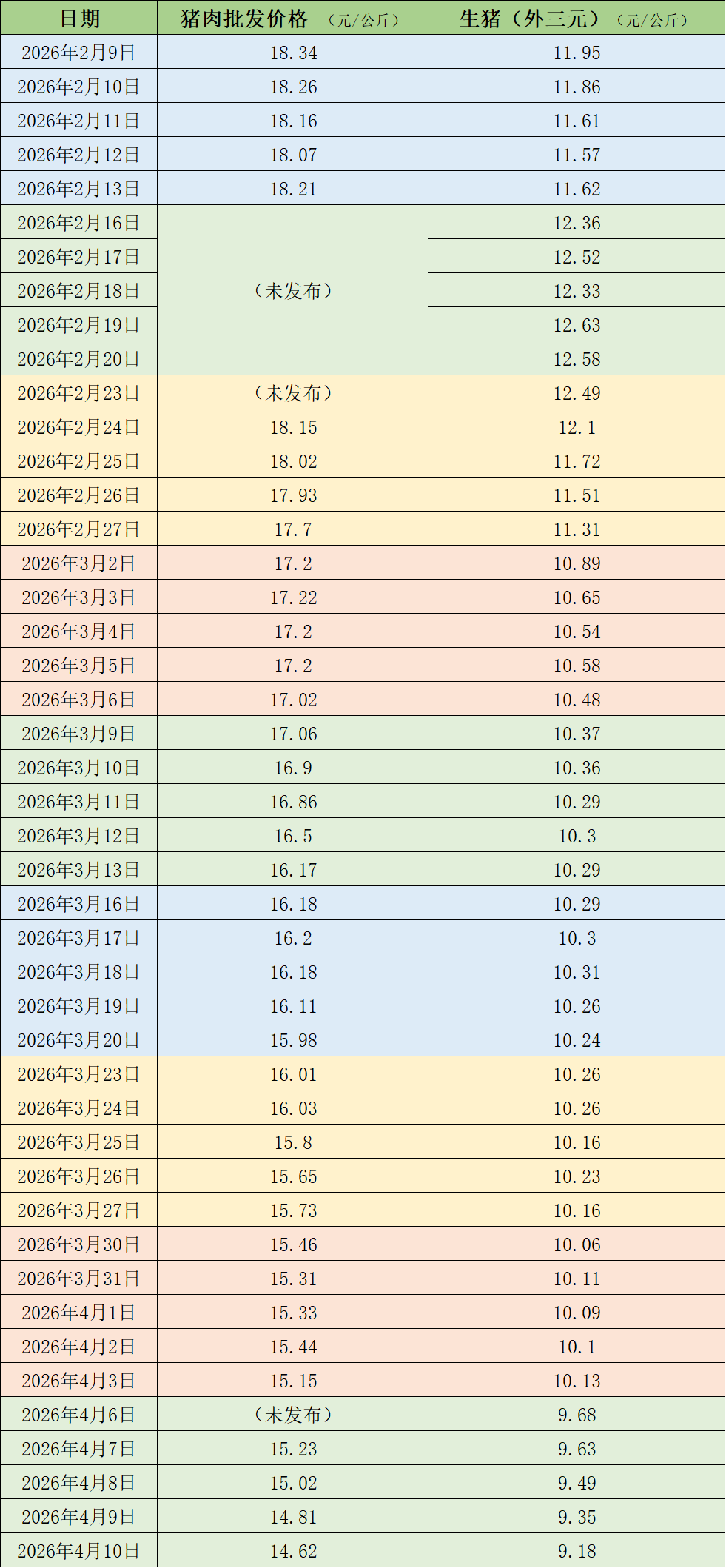 本周国内生猪周均价环比下跌。据中国养猪网的数据,4月10日,生猪(外三元)价格为9.18元/公斤,与上周五(4月3日)的10.13元/公斤相比,下降9.4%。从一周均价来看,本周生猪均价为9.47元/公斤,与上周10.1元/公斤的均价相比,下降6.2%。