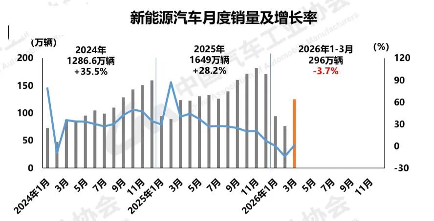 新能源汽车方面,3月,中国新能源汽车产销分别完成123.1万辆和125.2万辆,环比分别增长77.3%和63.7%,产量同比下降3.6%、销量同比增长1.2%,新能源汽车新车销量达到汽车新车总销量的43.2%。1月—3月,新能源汽车产销累计完成296.5万辆和296万辆,同比分别下降6.8%和3.7%,新能源汽车新车销量达到汽车新车总销量的42%。