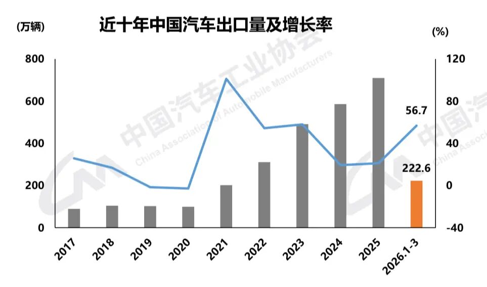 4月10日,中国汽车工业协会(简称“中汽协”)召开沟通会,发布一季度汽车产销数据。据披露,2026年第一季度,中国汽车产销同比分别下降6.9%和5.6%。一季度,中国新能源汽车产销同比分别下降6.8%和3.7%,新能源汽车新车销量达到汽车新车总销量的42%。出口成为2026年第一季度中国汽车行业的最大亮点。中国汽车一季度出口222.6万辆,同比增长56.7%。其中,新能源汽车出口95.4万辆,同比增长超过120%。