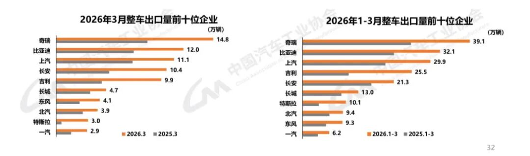 3月,整车出口前十企业中,奇瑞汽车出口14.8万辆,同比增长71.3%,占出口总量的16.9%。特斯拉出口增速显著,出口达3万辆,同比增长超过530%。1月—3月,整车出口前十企业中,奇瑞汽车出口39.1万辆,同比增长54.4%,占出口总量的17.6%。与去年同期相比,特斯拉出口增速显著,出口达10.1万辆,同比增长超过160%。