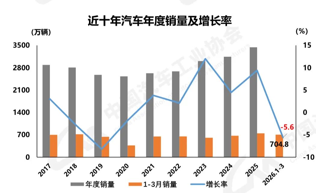 根据中汽协统计,2026年3月,中国汽车产销分别完成291.7万辆和289.9万辆,环比分别增长74.4%和60.6%,同比分别下降3%和0.6%。1月—3月,汽车产销累计完成703.9万辆和704.8万辆,同比分别下降6.9%和5.6%。