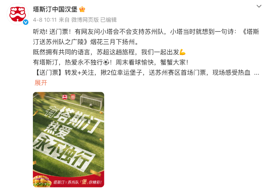 今年赞助商的加入,不少也源于网络热梗的“神助攻”。如苏州队的新队徽,因红金配色被网友调侃“像汉堡logo”。塔斯汀顺势营销:4月8日,2026“苏超”苏州赛区赛事合作信息公布,塔斯汀正式成为苏州赛区赞助商。
