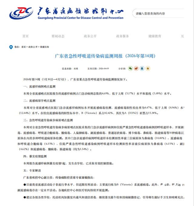 4月9日,广东省疾病预防控制中心发布广东省急性呼吸道传染病监测周报(2026年第14周)。周报显示,3月30日—4月5日,全省流感哨点医院报告的流感样病例占门急诊病例总数的4.69%,低于上周(5.17%)水平和基线(5.89%)水平,报告流感样病例暴发疫情1起,发生在学校,已采取有效控制措施。