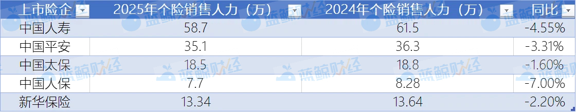 近两年,个险渠道人力规模下滑速度明显收拢,队伍规模进入筑底阶段。蓝鲸新闻记者统计,截至2025年末,A股五大上市险企个险代理人规模人力合计133.34万人,较2024年末减少余额5.2万人,降幅约3.7%。其中,除体量较大的中国人寿、平安寿险外,其余三家寿险公司人力规模减员不足万人,太保寿险个险人力规模降幅仅1.6%。