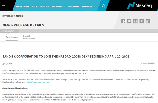闪迪将于2026年4月20日开盘前取代软件即服务(SaaS)巨头Atlassian Corp Plc加入该指数。