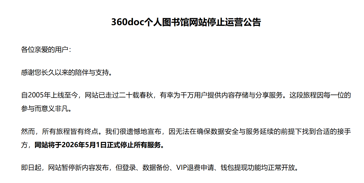 发布无偿转让公告失败后,360doc个人图书馆无奈发布了关停公告。360doc个人图书馆在网站主页上发布提示称,“360doc个人图书馆将于2026年5月1日停止服务。”