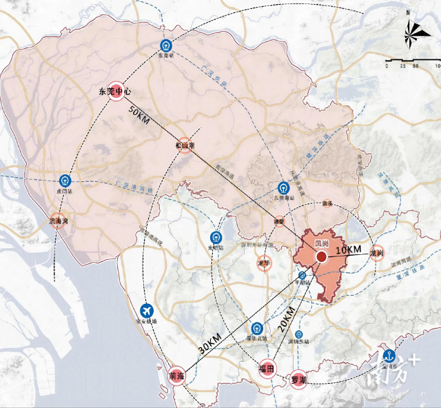 它不像其他临深片区那样只是边界触碰,而像一个“钻石”,东、南、西三面直接嵌进深圳龙岗的肌理里。从平湖到观澜,从龙岗中心城到横岗,凤岗几乎是被深圳的臂弯环抱着的。