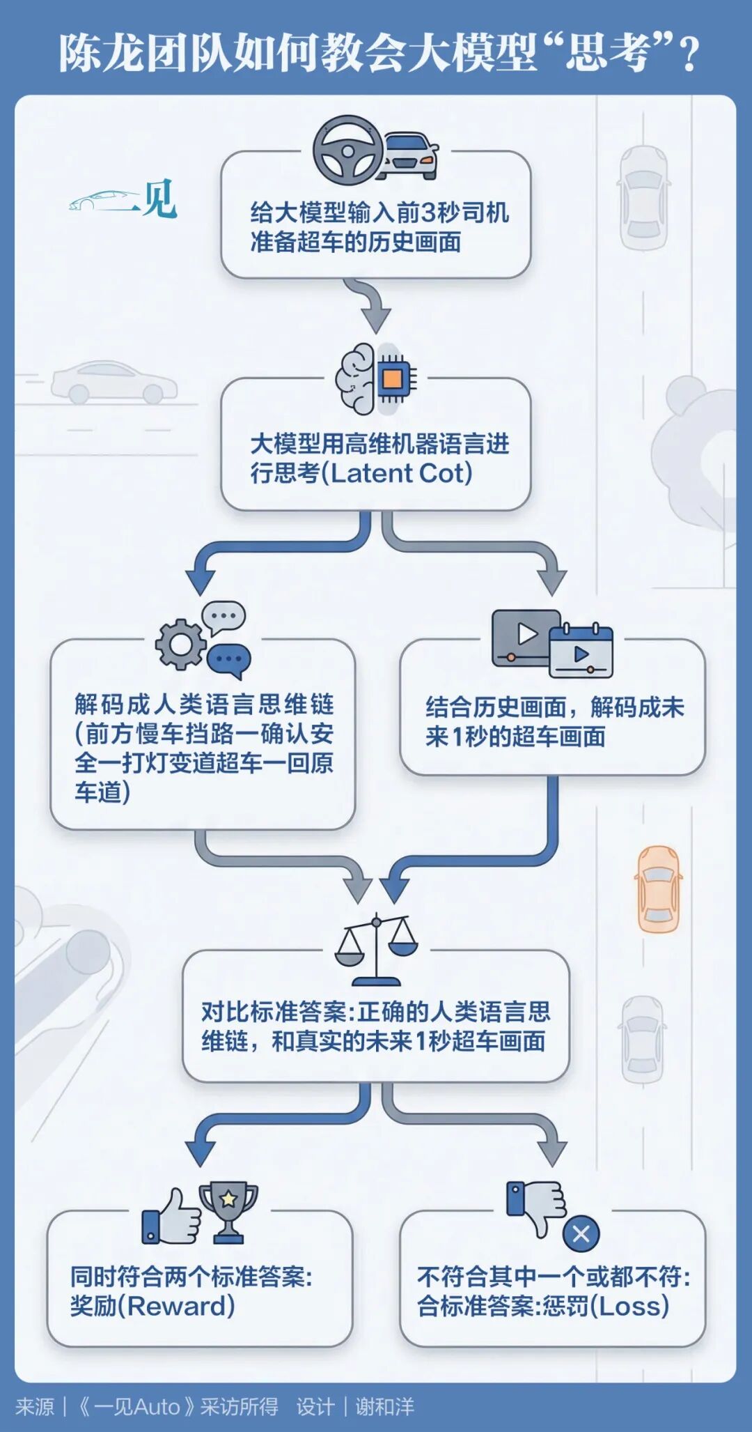 以超车为例:给XLA一段车辆跟在前方慢车后的画面,让XLA自己思考,再翻译成人类语言思维链,如果能还原出“前方慢车挡路一确认安全一打灯变道超车一回原车道”的人类语言,说明它正确理解了人类驾驶的思考逻辑。团队不需要用人力监督XLA生成的语言思维链是否正确,而是可以通过“模型监督模型”,使用罗福莉团队新开发的MiMo-V2-omni进行监督,“它的视觉语言能力很强”;
