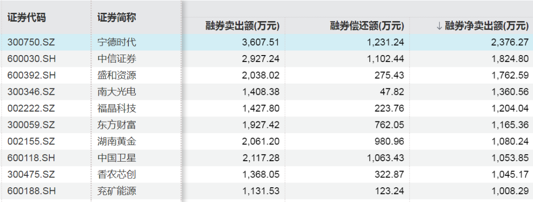 上周融券净卖出额居前的股票为宁德时代、中信证券、盛和资源,分别为2376.27万元、1824.80万元、1762.59万元。