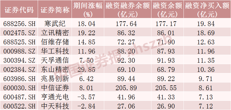从个股情况来看,上周融资客对135只股票加仓金额超1亿元,加仓居前的10只股票分别为寒武纪、立讯精密、佰维存储、华工科技、天孚通信、东山精密、兆易创新、中信证券、亨通光电、中天科技,分别净买入19.84亿元、18.69亿元、12.63亿元、11.96亿元、11.35亿元、10.36亿元、9.71亿元、8.61亿元、7.13亿元、7.12亿元。从市场表现上看,上周融资客加仓居前十的股票多数上涨,涨幅最大的东山精密涨近30%。