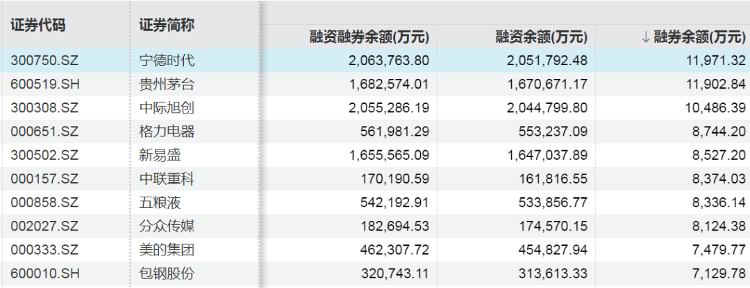 Wind数据显示,截至4月10日,A股市场融券余额居前的股票分别为宁德时代、贵州茅台、中际旭创,融券余额分别为1.20亿元、1.19亿元、1.05亿元。