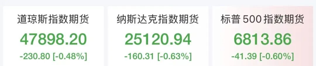 美股三大股指期货全线走低,道琼斯指数期货跌近0.5%,纳斯达克指数期货跌超0.6%,标普500指数期货跌0.6%。