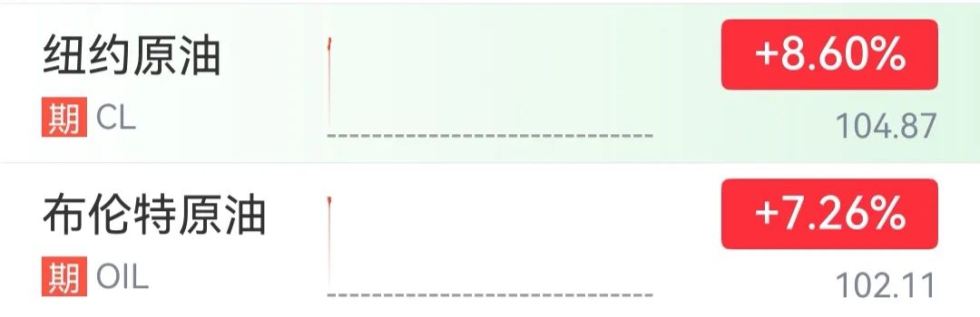 截至发稿,WTI原油涨8.6 % 、布伦特原油期货涨7.26%。现货黄金跌1.6%,现货白银跌2.81%。