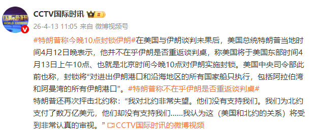 在美国与伊朗谈判未果后,美国总统特朗普当地时间4月12日晚表示,他并不在乎伊朗是否重返谈判桌,称美国将于美国东部时间4月13日上午10点、也就是北京时间今晚10点对伊朗实施封锁。美国中央司令部此前也称,封锁将“对进出伊朗港口和沿海地区的所有国家船只执行,包括阿拉伯湾和阿曼湾的所有伊朗港口”。