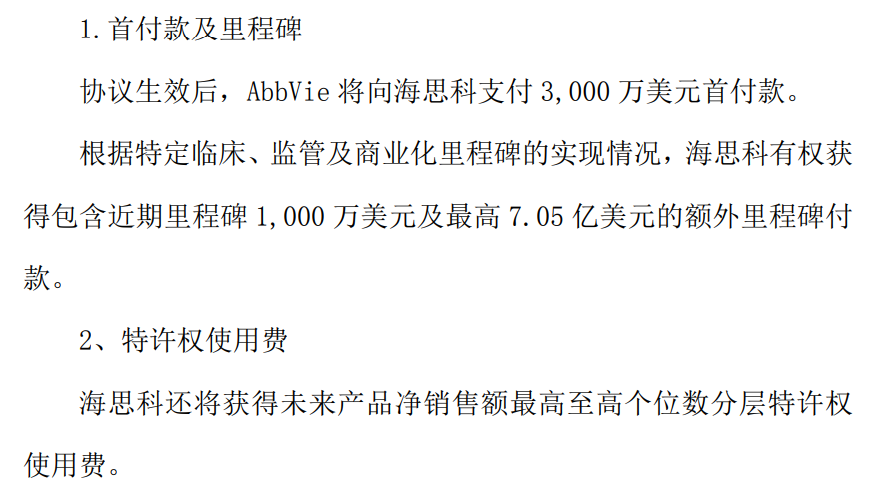 作为此次对外许可交易对价一部分,海思科将从AbbVie获得Nav1.8项目授权许可费(3000万美元的首付款及最高7.15亿美元的额外里程碑付款)。此外,AbbVie还将会支持授权品种Nav1.8抑制剂在合作项下开发至临床概念验证的一定的研发成本。