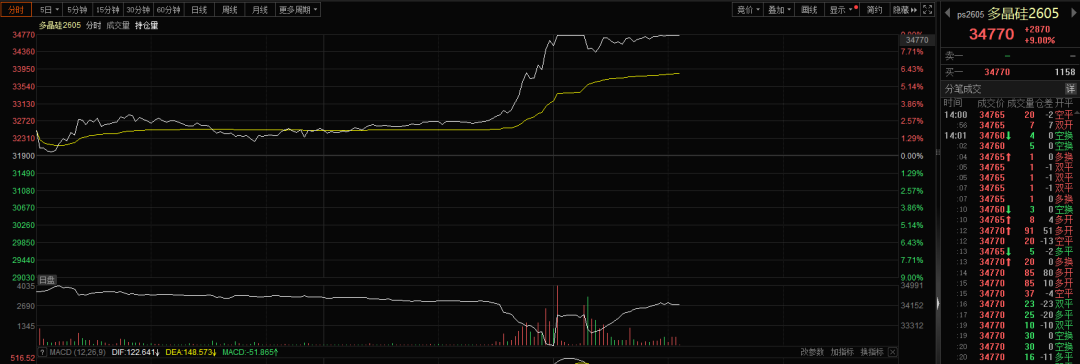 4月13日午后,多晶硅期货主力合约涨停,报34770元/吨。同时,A股硅料龙头通威股份( 600438 )涨停,大全能源同样走高,截至发稿,涨超10%。