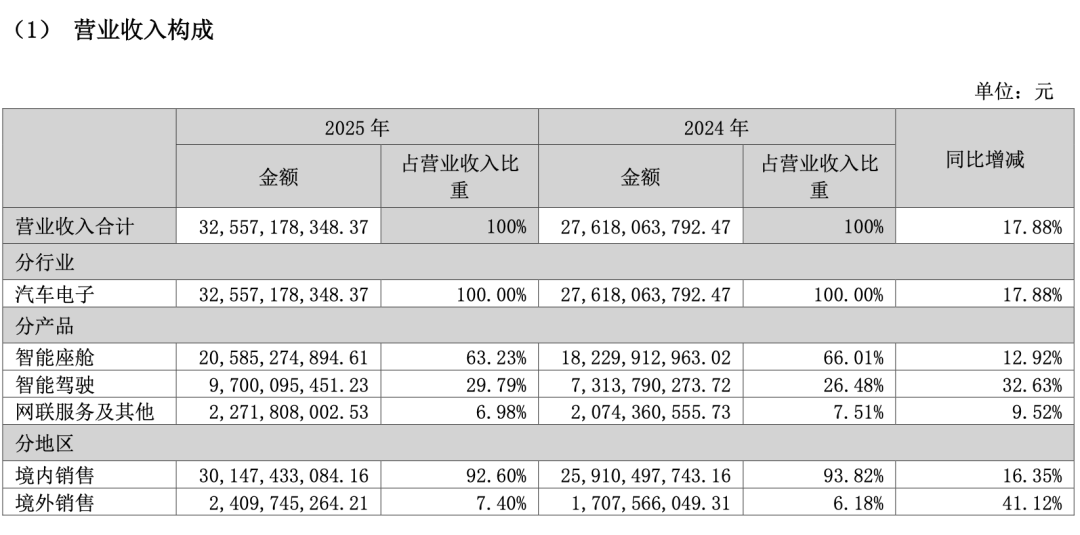 2025年,德赛西威营收为325.57亿元,同比增长17.88%。其中智能座舱业务全年营收为205.85亿元,同比增长12.92%;智能驾驶业务全年营收为97亿元,同比增长32.63%。两项业务占整体营收比重分别为63.23%、29.79%。