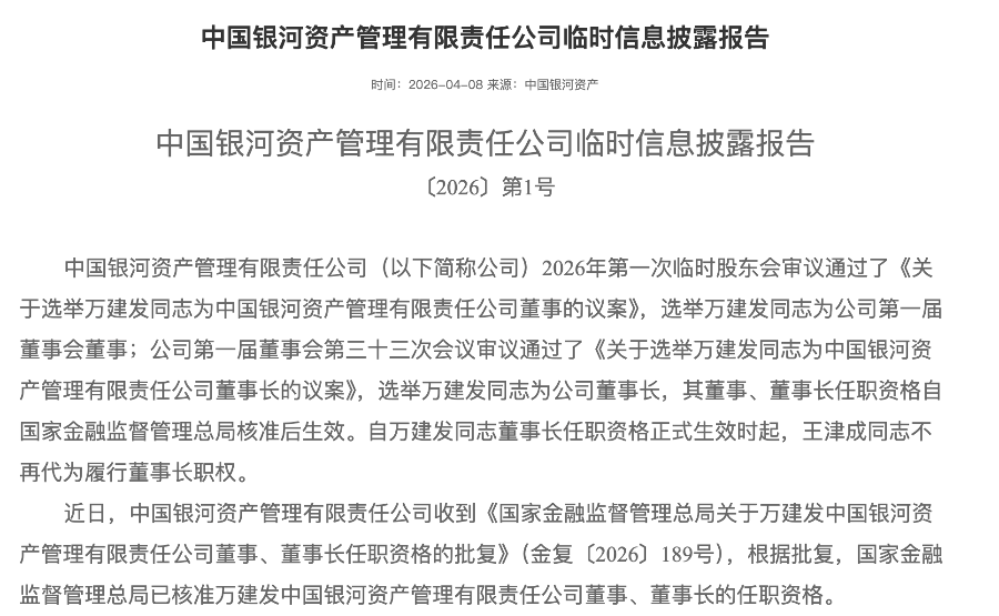 据悉,中国银河资产2026年第一次临时股东会审议通过相关议案,选举万建发为公司第一届董事会董事;随后召开的第一届董事会第三十三次会议审议通过了《关于选举万建发同志为中国银河资产管理有限责任公司董事长的议案》。其董事、董事长任职资格自国家金融监督管理总局核准后正式生效,自万建发董事长任职资格生效之时起,王津成不再代为履行董事长职权。