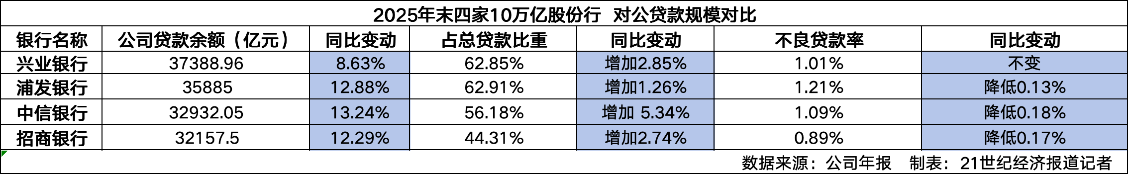 在12家全国性股份制商业银行中,招商银行、兴业银行、中信银行、浦发银行四家总资产接续迈入10万亿元关口,构成股份行第一梯队。四家银行总资产合计占12家股份行总资产的半壁江山,2025年末公司贷款余额纷纷迈入3万亿元门槛,头部效应愈发显著。