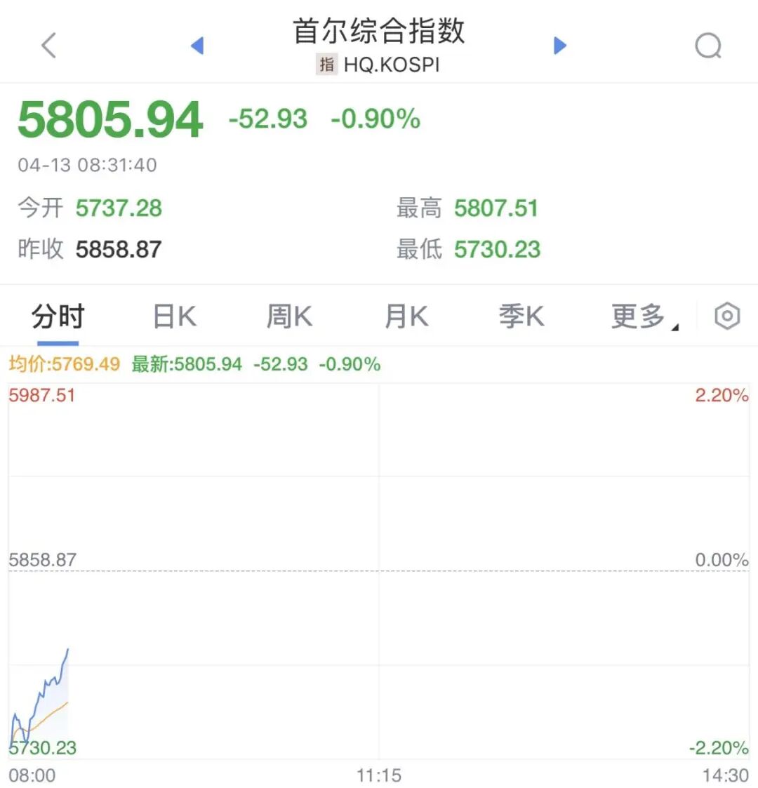 美国下令封锁霍尔木兹海峡 , 加剧紧张局势 。4月13日,日韩股市集体低开,韩国综合指数开盘跌超2%,随后震荡拉升。