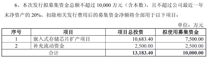 根据预案,嵌入式存储芯片扩产项目总投资为1.07亿元,公司拟投入7500万元募集资金用于该项目,剩余2500万元用于补流。