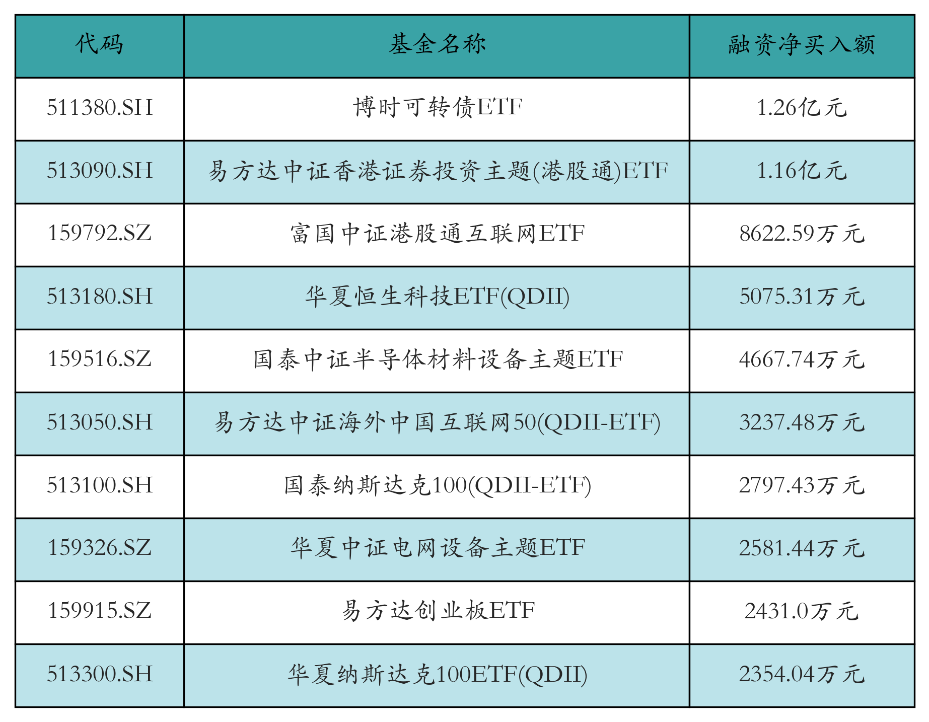 4月10日ETF融资净买入额前三位分别为:博时可转债ETF(1.26亿元)、易方达中证香港证券投资主题(港股通)ETF(1.16亿元)和富国中证港股通互联网ETF(8622.59万元),前10具体见下表: