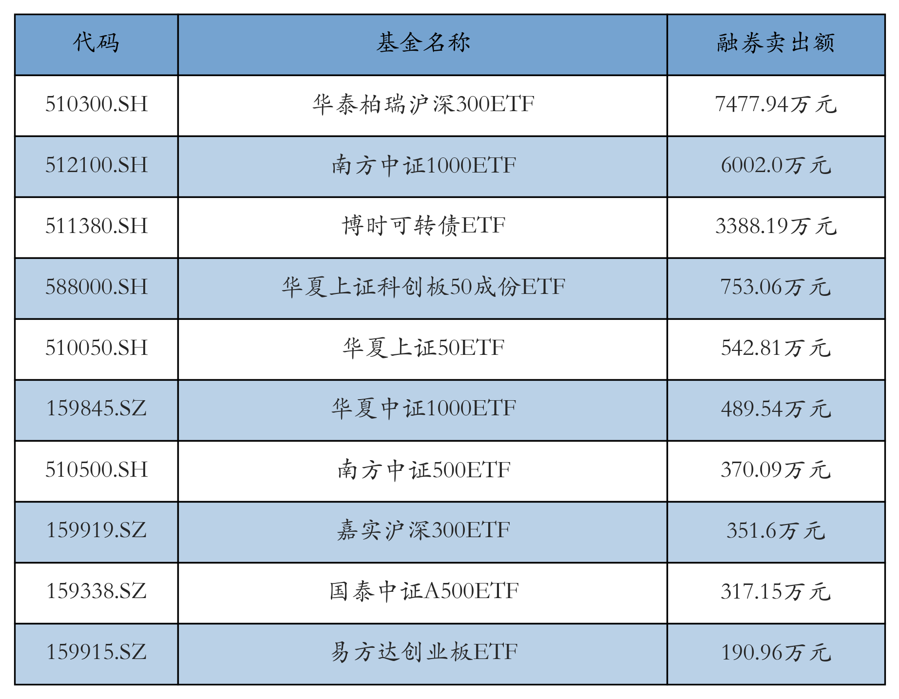 4月10日ETF融券卖出额前三位分别为:华泰柏瑞沪深300ETF(7477.94万元)、南方中证1000ETF(6002.0万元)和博时可转债ETF(3388.19万元),前10具体见下表: