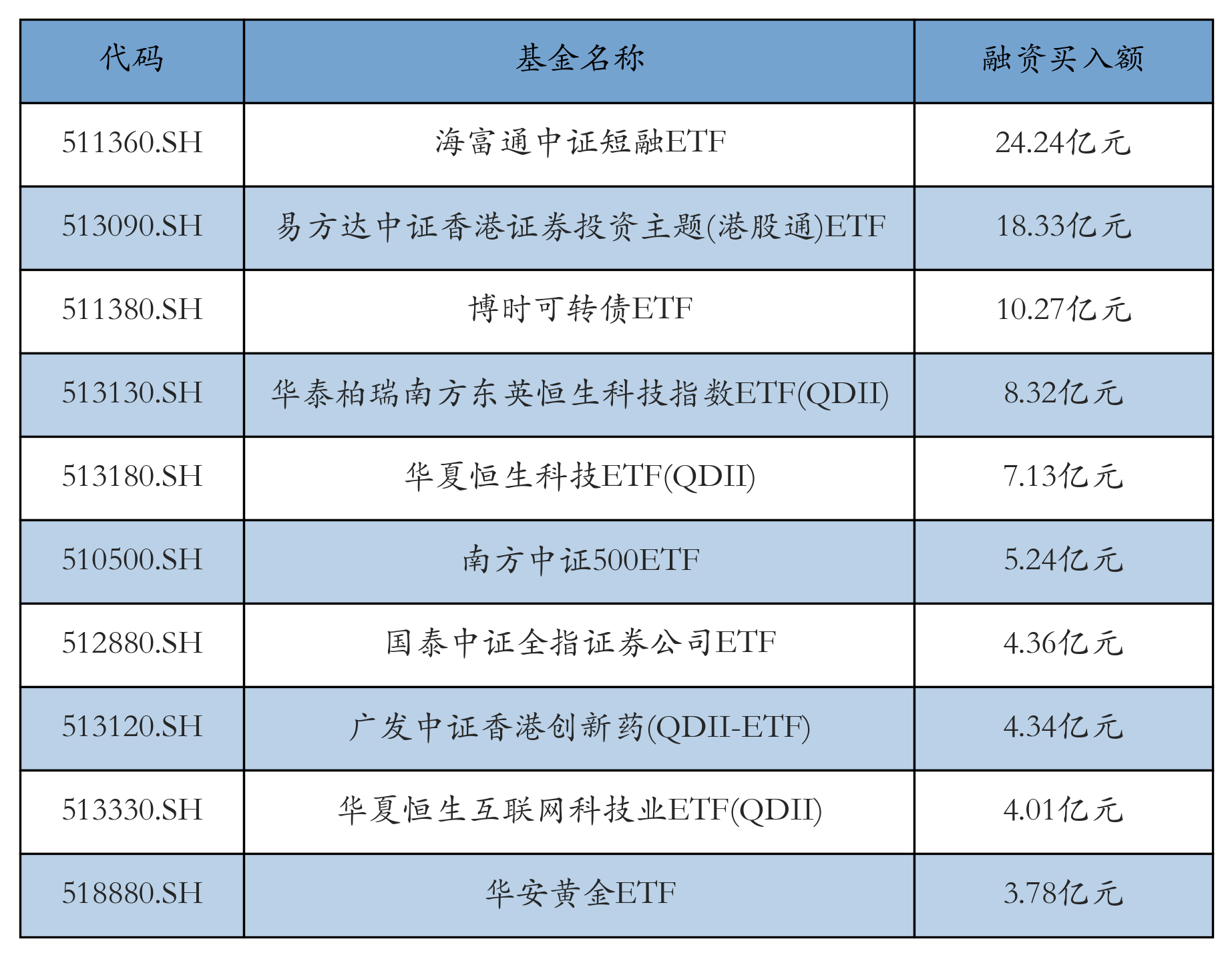 4月10日ETF融资买入额前三位分别为:海富通中证短融ETF(24.24亿元)、易方达中证香港证券投资主题(港股通)ETF(18.33亿元)和博时可转债ETF(10.27亿元),前10具体见下表: