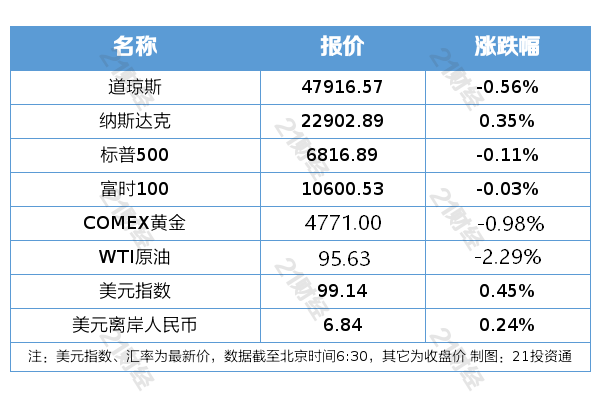 纽约股市三大股指4月10日涨跌不一。截至4月10日收盘,道琼斯工业平均指数比前一交易日下跌269.23点,收于47916.57点,跌幅为0.56%;标准普尔500种股票指数下跌7.77点,收于6816.89点,跌幅为0.11%;纳斯达克综合指数上涨80.47点,收于22902.89点,涨幅为0.35%。
