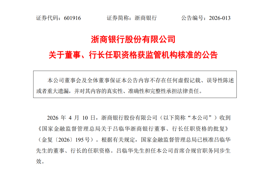 4月10日,浙商银行发布公告称,已收到《国家金融监督管理总局关于吕临华浙商银行董事、行长任职资格的批复》。根据有关规定,国家金融监督管理总局已核准吕临华 的 董事、行长的任职资格,其兼任的该行首席合规官职务同步生效。
