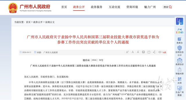 4月11日,广州市人民政府发布通报,对在中华人民共和国第三届职业技能大赛上取得优异成绩的广州获奖选手、技术指导专家、教练、保障单位及个人予以通报表扬和奖励。其中,金牌选手及其技术指导专家组各获奖金25万元。