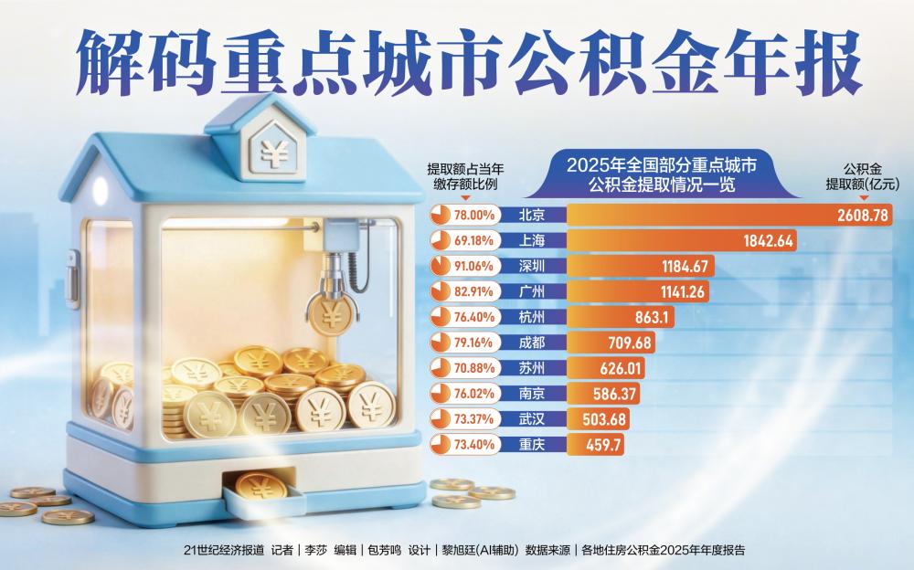 从2025年各地公积金提取情况来看,各地2025年公积金提取额在459.7亿元~2608.78亿元之间,其中北京、上海、深圳和广州提取额均超过1000亿元,分别为2608.78亿元、1842.64亿元、1184.67亿元、1141.26亿元。10城2025年公积金提取额占当年缴存额的比例在69%以上,其中深圳占比最高,为91.06%。