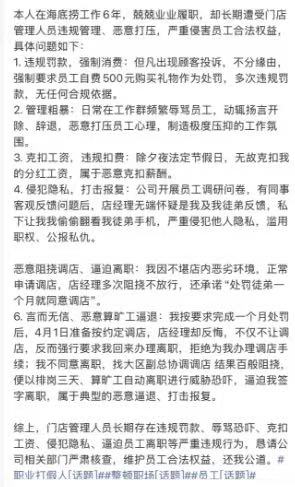 4月9日,一位自称“在海底捞工作6年的员工”的网友发布长文,描述其在海底捞北京某门店长期遭受的违规管理。该网友表示,“门店管理人员恶意打压,严重侵害员工合法权益。”其中包含,“但凡出现顾客投诉,不分缘由,强制要求员工自费500元购买礼物作为处罚,多次违规罚款,无任何合规依据。”