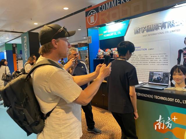 展区一角,深圳大象安泰科技有限公司的仿真人形机器人翩翩起舞,吸引不少客商停下拍照。该公司商务总监周渝奇表示,他们专门做仿真人形机器人,希望凭借小众赛道借港澳出海。“做我们这个板块的厂家在国内很少,国际上量产的也极少。从去年开始,我们就频繁参加香港、澳门的展会,希望通过这两个平台拓展海外市场。”