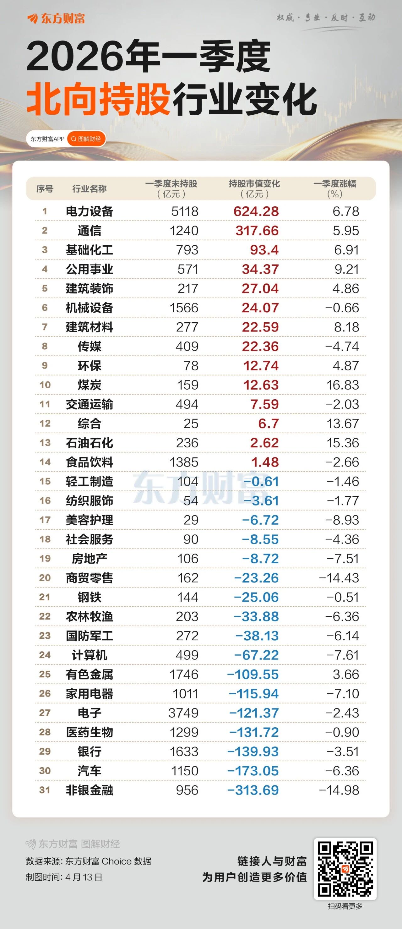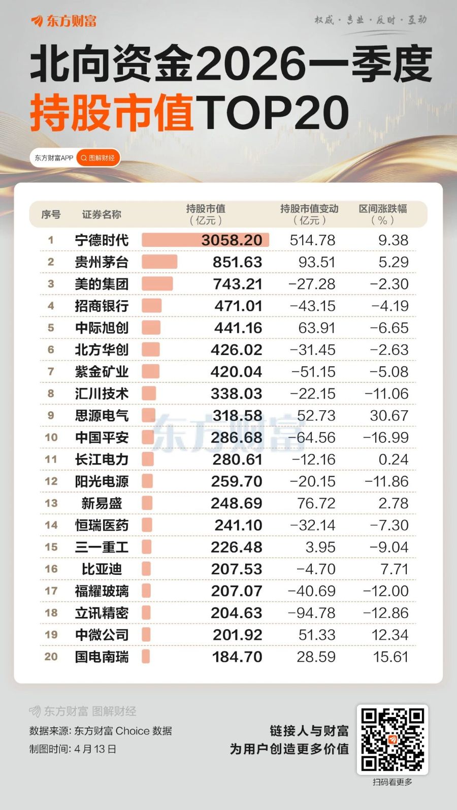 沪深股通2026年一季度持股数据公布。统计数据显示,截至2026年一季度末,北向资金共持有3782只个股,持仓总规模约2.58万亿元,较2025年四季度末的2.59万亿元略微下滑,同期上证指数微跌1.94%。 行业层面,电力设备、通信板块、基础化工行业获青睐,持股市值分别增长624亿元、318亿元、93亿元,公用事业、建筑装饰、机械设备、建筑材料等板块的持股市值也有明显增长,而非银金融、汽车、银行、医药生物等共7个行业的持股市值则减少超100亿元。 个股层面,宁德时代、天孚通信、贵州茅台持股市值增加最多,分别增长515亿元、111亿元和94亿元,市值增加均超过同期涨幅;立讯精密、寒武纪、中国平安持股市值减少最多,分别减少94.78亿元、72.89亿元和64.56亿元。截至一季度末,宁德时代仍是北向资金第一大持仓股,持股市值达3058亿元,是第二大持仓股贵州茅台(852亿元)的3.59倍,是第三大持仓股美的集团(743亿元)的4.11倍。#北向资金#一季度持仓#持股市值#电力设备#通信#宁德时代#贵州茅台