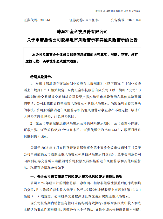 在2025年年报披露大限来临之际,深陷退市风险警示的珠海汇金科技股份有限公司(证券简称:*ST汇科,证券代码:300561)交出了关键答卷。2026年4月10日,公司正式披露2025年年度报告并同步发布《关于申请撤销公司股票退市风险警示和其他风险警示的公告》,公司称已正式向深交所递交“摘帽”申请。消息一出,*ST汇科股价当日开盘即封死涨停板,报13.57元/股,涨幅19.98%,市值升至44.52亿元。4月13日,摘帽预期进一步发酵,*ST汇科再度一字涨停,报16.28元/股,涨幅19.97%,总市值攀升至53.42亿元。4月14日,上涨1.66%,收盘价为16.55元/股。