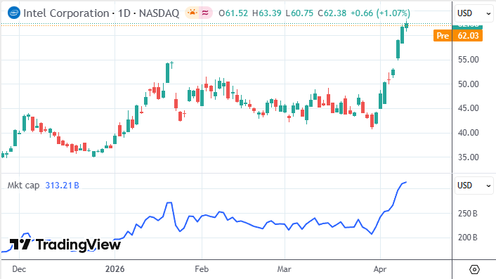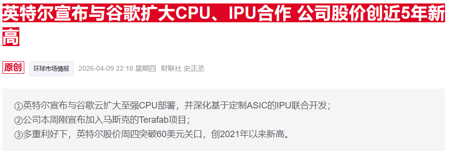 上周,英特尔又宣布加入埃隆·马斯克的Terafab项目,为特斯拉、SpaceX以及xAI开发半导体,进一步提振股价。此外,谷歌也承诺将在未来的数据中心中采用英特尔Xeon处理器。