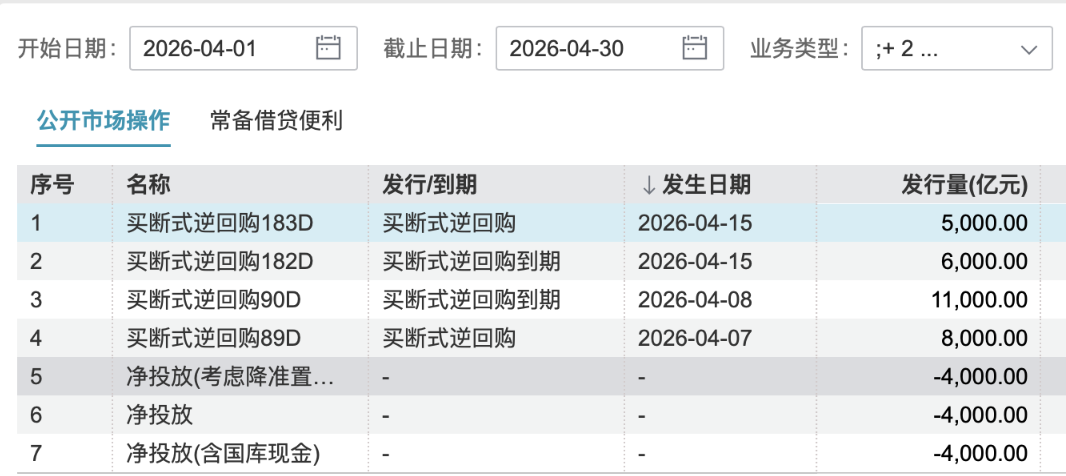 4月14日,央行发布公告称,为保持银行体系流动性充裕,2026年4月15日,中国人民银行将以固定数量、利率招标、多重价位中标方式开展5000亿元买断式逆回购操作,期限为6个月(183天),到期日为2026年10月15日(遇节假日顺延)。