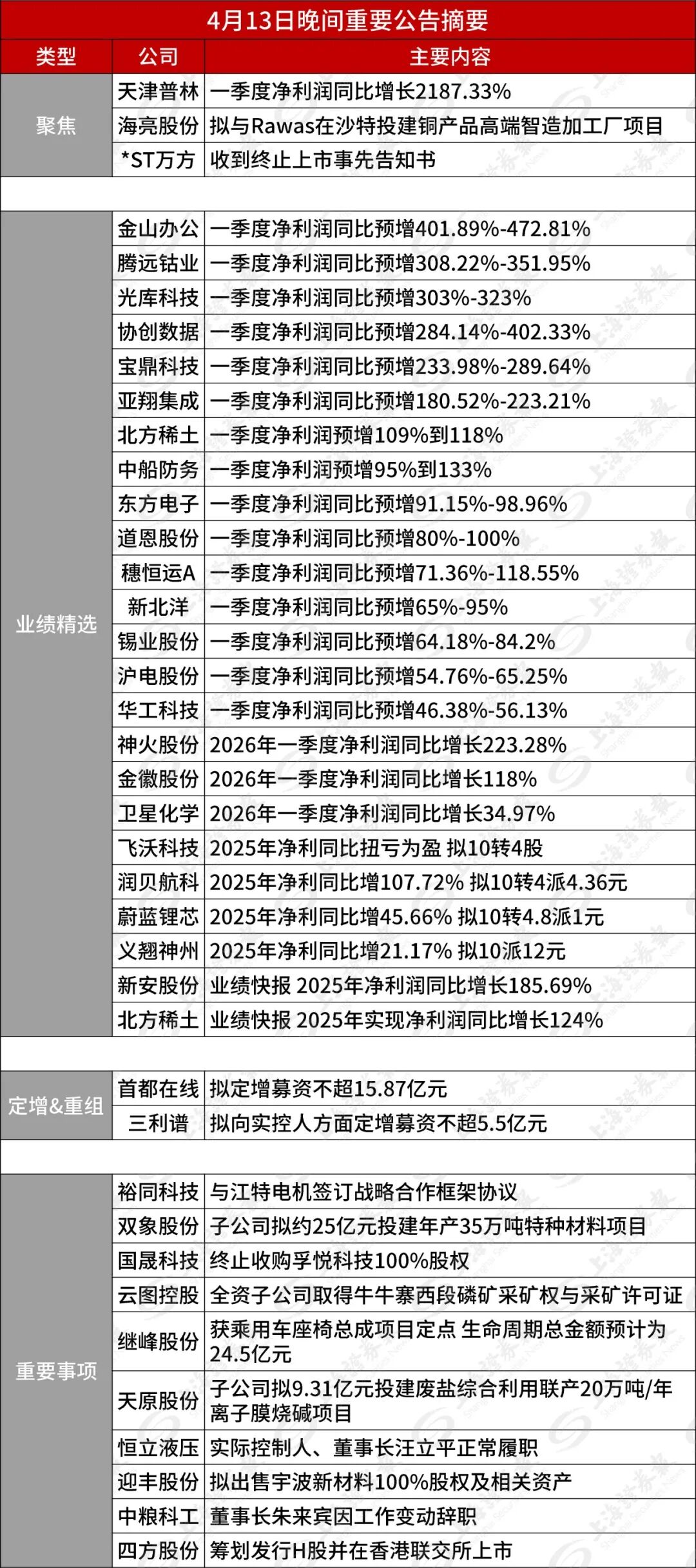 (备注:数据截至13日21:30,后续公告内容请下载上证报APP在快讯栏目查看;或在微信首页菜单“上证财讯”中查看。)